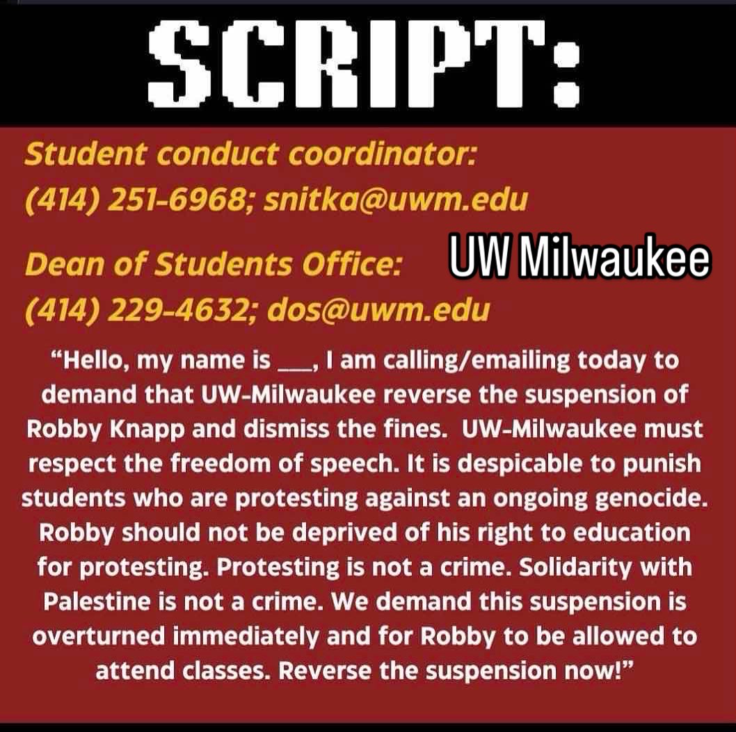 Categories Uncategorized Hands Off UW Milwaukee Students! – Stop the Suspensions! Call Now! Post author By wibailoutpeople Post date November 7, 2024 Share this: Share on X (Opens in new window) X Share on Facebook (Opens in new window) Facebook Like Loading... Related ← Working class activists and U.S. President cross paths in Baltimore → Milwaukee 11/9/24 and Madison 11/10/24: Reproductive Justice Now! – Build the People’s Movement!