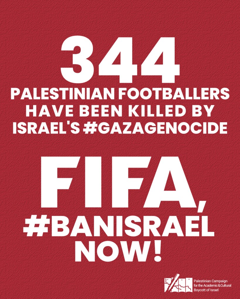 | 344 young Palestinian footballers have been killed during Israel’s ongoing, livestreamed Gaza genocide. That’s almost one per day since Israel began its genocidal assault on 2.3 million Palestinians in the occupied Gaza Strip. Meanwhile, Israel is still allowed to participate in FIFA matches. Last week, mobs of racist Israeli fans of Maccabi Tel Aviv football team incited to genocide and went on a violent rampage in Amsterdam ahead of and after the Europa League match against Ajax. The criminal Israeli gangs violently attacked persons appearing to be Arab and homes displaying support for Palestinian rights. It shouldn’t come as a surprise. The Maccabi Tel Aviv team itself has sent “care packages” to Israeli soldiers committing genocide in Gaza and organized “motivational” videos of its many employee soldiers in Gaza. Genocidal apartheid Israel should not be playing in any FIFA matches. FIFA has been shielding Israel’s brutal, decades-old regime of apartheid, and now genocide, from accountability for years. But pressure is mounting and we won’t be silent. Thanks to our incessant calls and even official pressures, FIFA was forced to vote on banning Israel. While it ultimately voted to once again delay a decision, it is a sign that our pressure is having an effect. Today, during the France vs Israel Nations League match, let’s maintain our commitment of #NoRestForFIFA. |
