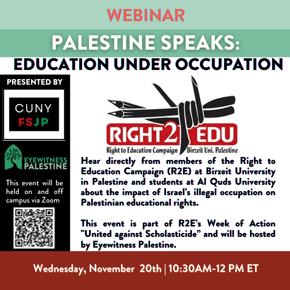 | Following a year of Israel’s destruction of every university in Gaza, ongoing colonial violence across the West Bank, and the repression of campus protests and encampments for Palestine across the US, concerned students and faculty at The City College of New York will gather on campus to hear from members of the Right to Education Campaign (R2E) at Birzeit University and students from Al Quds University in Palestine about the impact of Israel’s illegal occupation on Palestinian educational rights. This event is part of R2E’s Week of Action “United against Scholasticide” and will be hosted by Eyewitness Palestine. Join Eyewitness Palestine on November 20, 10:30AM ET to hear directly from members of the right to education campaign (R2E). |
