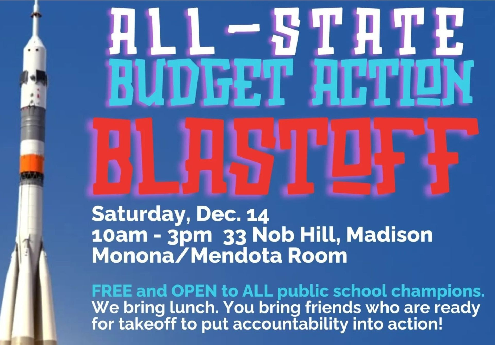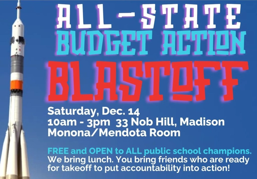 | All-State Budget Action Blastoff Saturday, Dec. 1410AM – 3PM WEAC Building 33 Nob Hill Rd.Madison, WI |