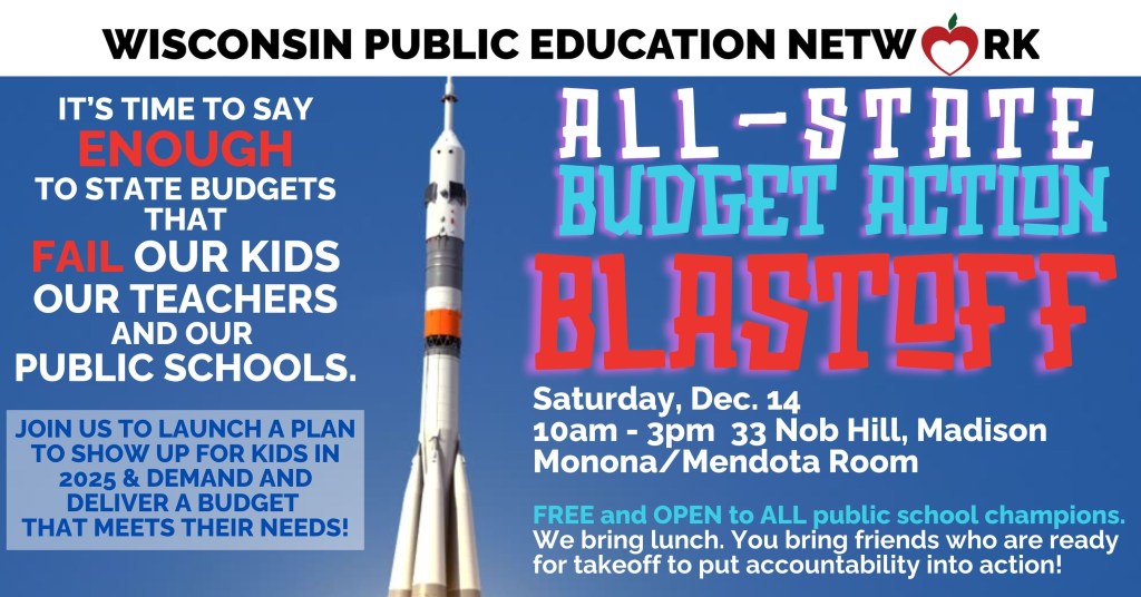 | Dear Wisconsin public school champions, You’re invited to our All-State Budget Action Blastoff on December 14 in Madison: join us to launch a plan to show up for kids in 2025 and demand and deliver a budget that meets their needs! FREE and OPEN to ALL public school champions. Tentative agenda includes: |