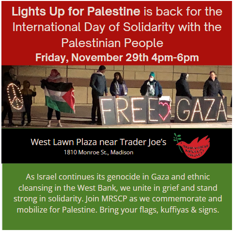 Categories Uncategorized Madison, November 29, 2024: Lights Up! for the International Day of Solidarity with the Palestinian People Post author By wibailoutpeople Post date November 23, 2024 Check the MRSCP Face Book page for any changes or updates. 4-6 pm West Lawn Plaza, next to Trader Joe’s on Monroe Street Share this: Click to share on X (Opens in new window) X Click to share on Facebook (Opens in new window) Facebook Like Loading... Related ← “The walls sweat”: Community members hold press conference to address excessive heat in Wisconsin prisons → Madison, December 7, 2024: 28th Annual Fair Trade Holiday Festival