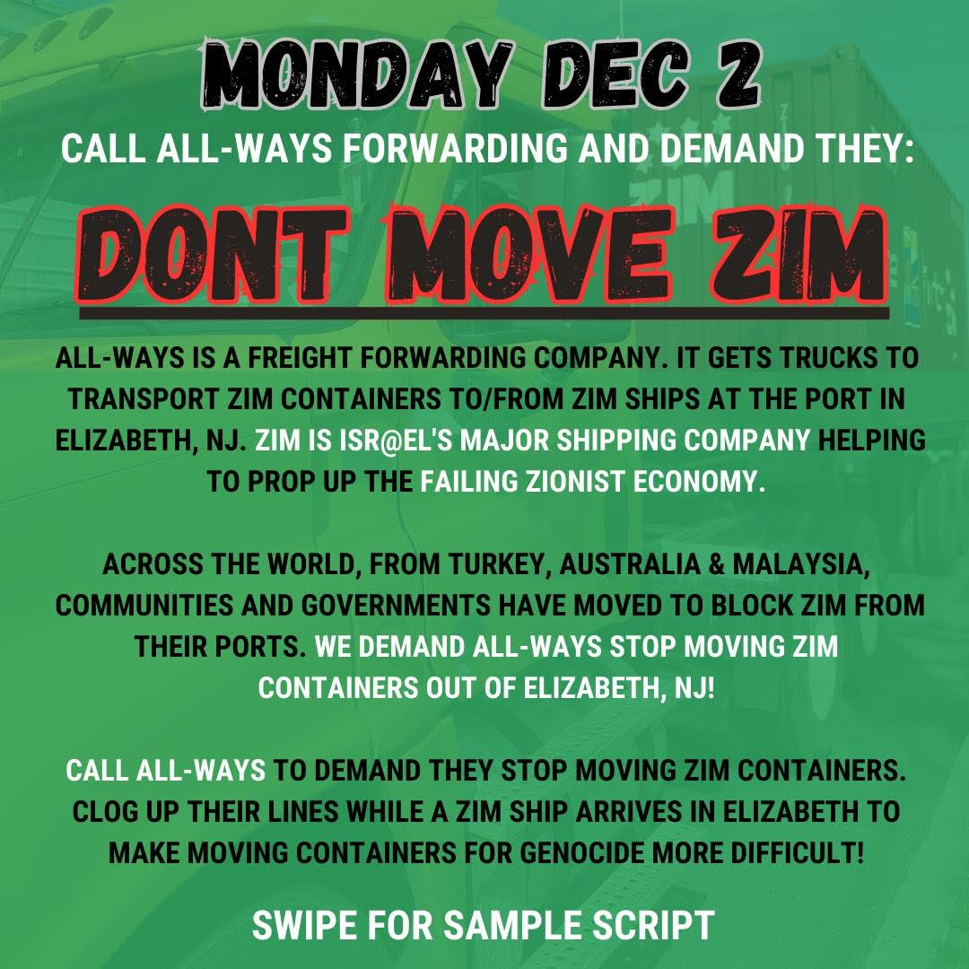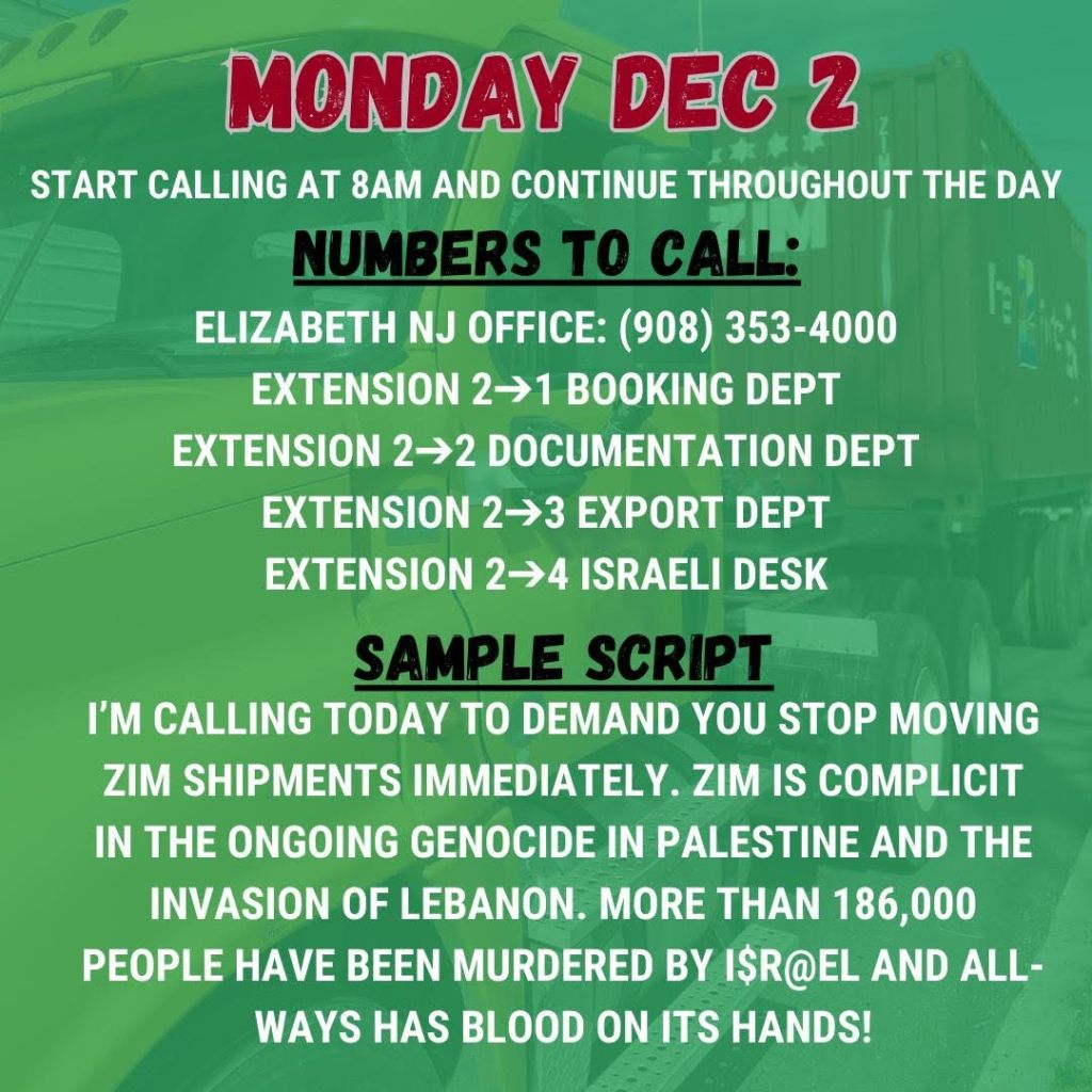 Call ALL-Ways Forwarding and demand they DON’T MOVE ZIM. There will be a ZIM shipment on Monday let’s clog their phone lines to make it impossible to do logistics for genocide!