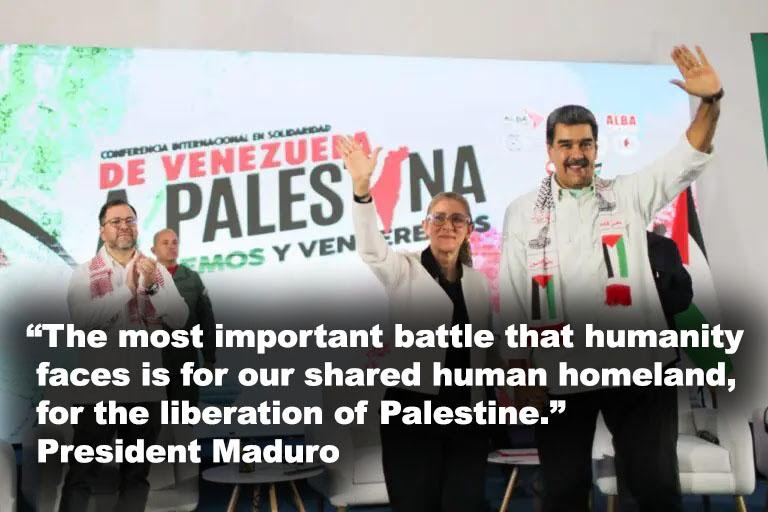 Al Mayadeen: President Maduro reaffirms solidarity with Palestine, warns of regional plots He affirmed that Venezuela stands with Palestine, stressing that the day will come when “we will meet in the streets of al-Quds as victors.” Speaking at the Global Conference for Solidarity with Palestine, Maduro emphasized that Palestine is the cause that unites humanity. He added, “Notice how the Zionists signed the agreement and then turned to Syria, launching attacks through the terrorist groups they sponsor, which are now attempting to take control of Aleppo.”