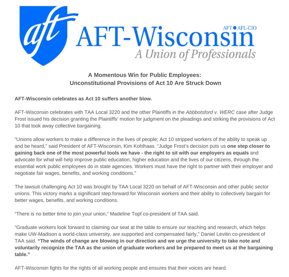 Categories Uncategorized AFT Wisconsin Release: A Win for Workers; Act 10 Struck Down Post author By wibailoutpeople Post date December 5, 2024 AFT-Wisconsin Share this: Click to share on X (Opens in new window) X Click to share on Facebook (Opens in new window) Facebook Like Loading... Related ← After Act 10 Overturned, Madison Teachers Union File Paperwork to Renew Full Collective Bargaining → Madison, December 18, 2024: State Worker Power Happy Hour