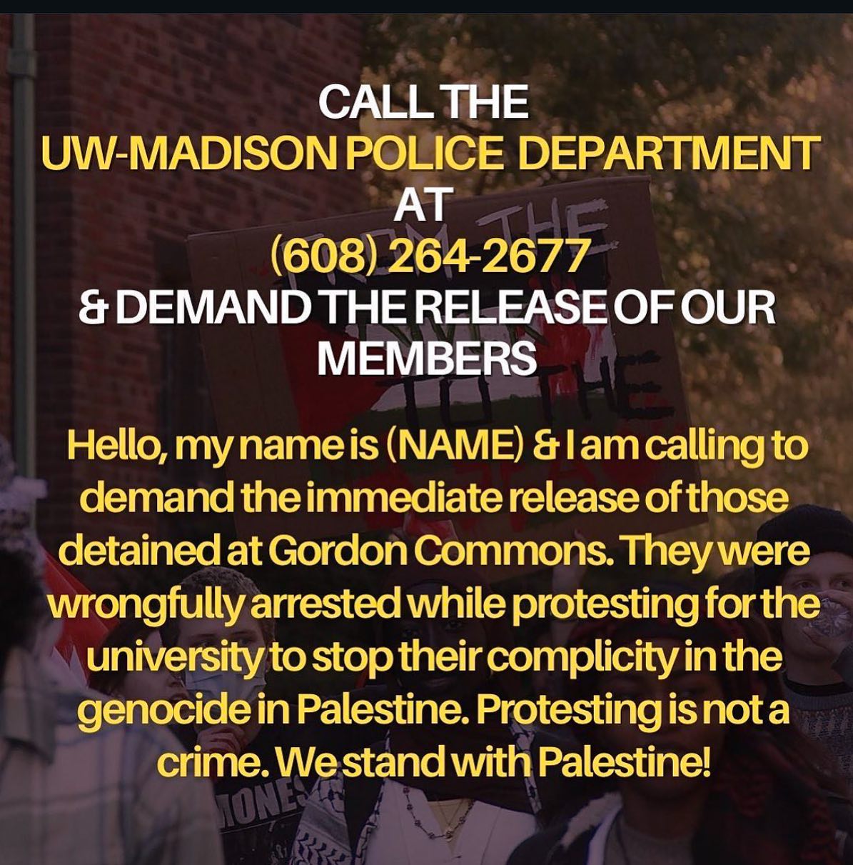 Categories Uncategorized Call UW Madison Police and Demand the Release of Those Demanding Divestment in Genocide at UW Board of Regents Meeting 12-5-24 Post author By wibailoutpeople Post date December 5, 2024 UW Madison December 5, 2024. / Photo: Wisconsin Bail Out The People Movement Share this: Click to share on X (Opens in new window) X Click to share on Facebook (Opens in new window) Facebook Like Loading... Related ← Dozens of UW Madison Students, Workers and Community Members Demand UW Regents Divest from U.S.-‘Israel’ Genocidal Apartheid (12-5-24) → Your Medical Debt is Just a Health Insurance CEO’s Profit!
