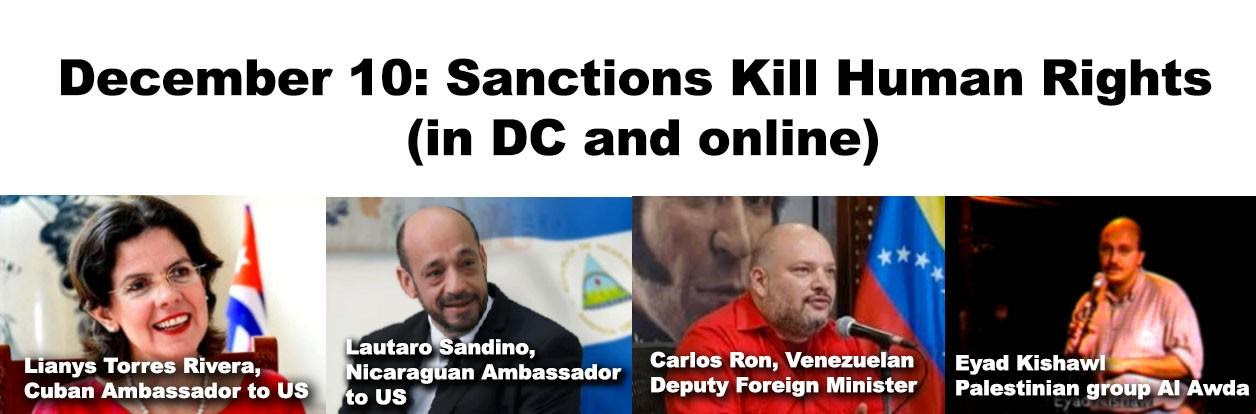 Dec. 10: How Sanctions Violate Human Rights in Palestine, Cuba, Nicaragua and Venezuela Cuba Ambassador Lianys Torres Rivera; Nicaragua Ambassador Lautaro Sandino; Carlos Ron, Venezuela Deputy Foreign Minister, Eyad Kishawi, Al-Awda Palestine activist; In person in DC (6:30 pm ET): Online (Zoom, 7:00 pm ET)