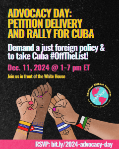 Join us for a petition delivery to Congress calling for an end to U.S. sanctions on our Latin American and Caribbean neighbors followed by a rally in front of the White House to tell the Biden Administration to remove Cuba from the State Sponsors of Terrorism (SSOT) list!
