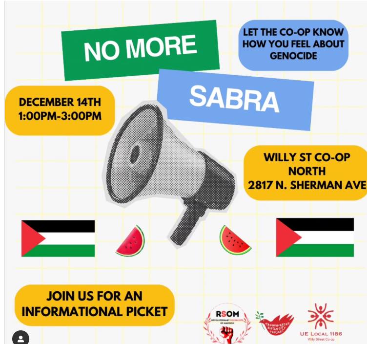 Categories Uncategorized No More Zionist Sabra Hummus – Informational Picket December 14, 2024 in Madison Post author By wibailoutpeople Post date December 12, 2024 Madison-Rafah Sister City Project Share this: Share on X (Opens in new window) X Share on Facebook (Opens in new window) Facebook Like Loading... Related ← Imperialism and the Destabilization of the Alliance of Sahel States → Why Israel Thinks It Won In Syria