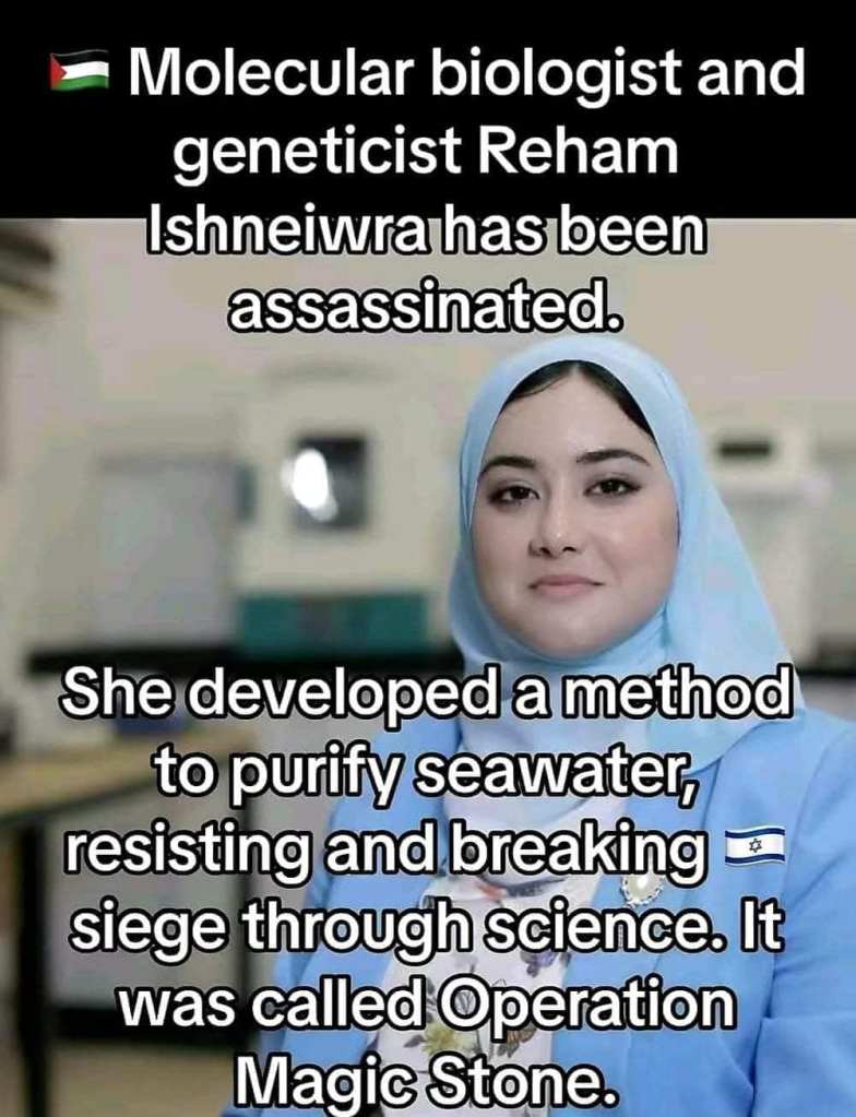 Categories Uncategorized Molecular Biologist and Geneticist Reham Ishneiwra Assassinated by U.S.-Israel War Criminals Post author By wibailoutpeople Post date December 13, 2024 Share this: Click to share on X (Opens in new window) X Click to share on Facebook (Opens in new window) Facebook Like Loading... Related ← Born Jewish in Nazi Europe: My Journey to Become Anti-Zionist → Berlin Conference 140 Years Later