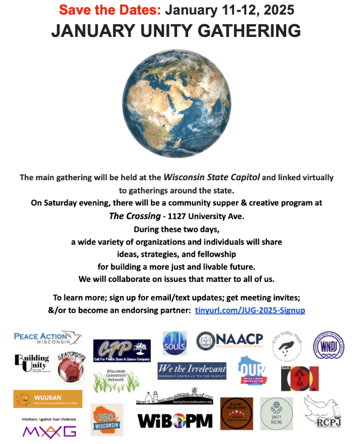 Now is the time for us to unite. For the sake of all people, for our planet, for peace, and for all life on Earth. We are holding a statewide 2-day “January Unity Gathering” in the Wisconsin State Capitol on January 11 and 12, 2025. (On that Saturday evening there will be a community supper and a concert at the Crossing – 1127 University Ave. – Madison, WI) We are providing overnight sleeping accommodations for people coming from outside of the Madison area.