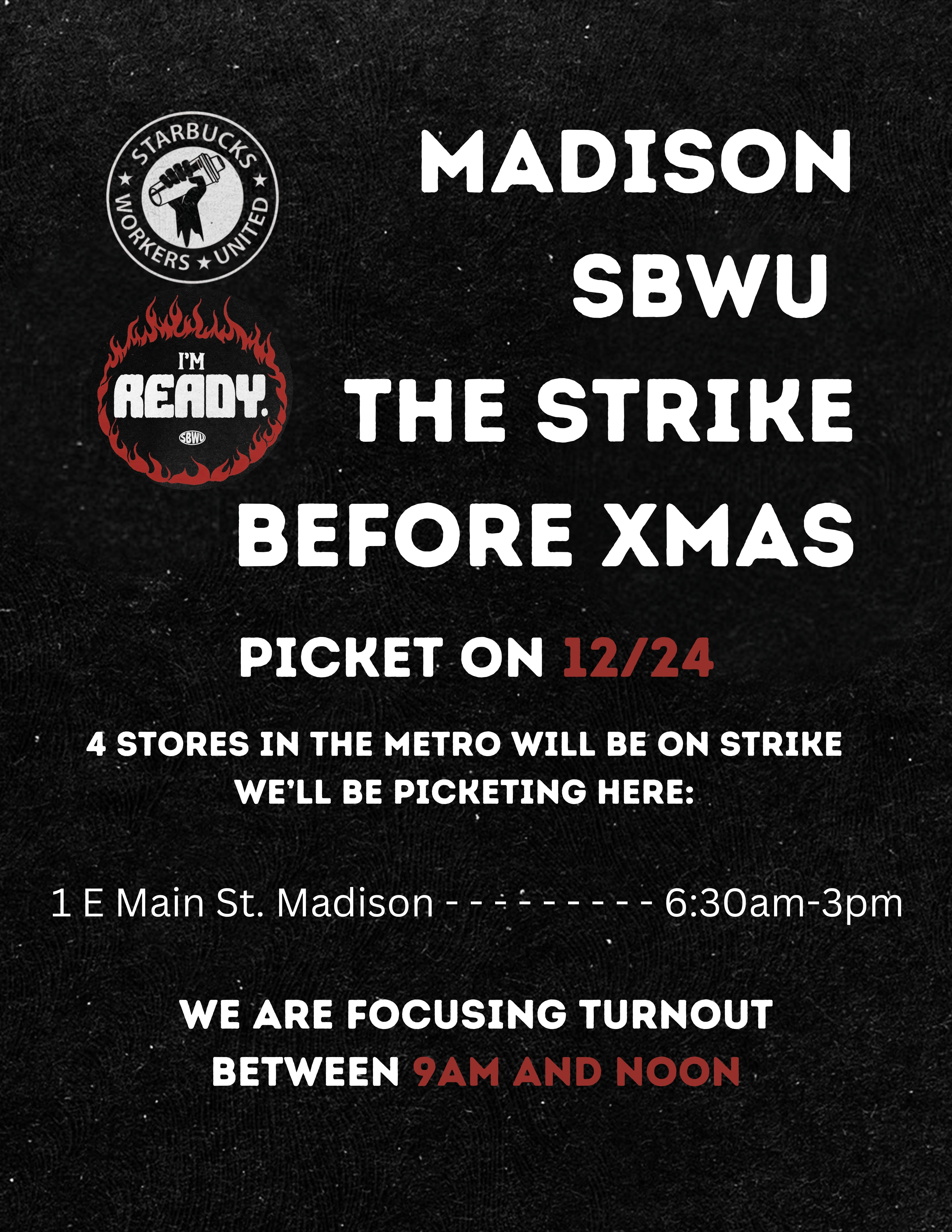 Join Starbucks workers at 1 E State Street in Madison from 6:30 A.M. – 3 P.M. as they participate in a 1 day Unfair Labor Practice (ULP) Strike against Starbucks on December 24, 2024. Starbucks REFUSES to offer workers fair economic proposals at the bargaining table and Starbucks Workers United needs community support to show them MADISON IS A UNION TOWN! For more information on the strike and ways to support visit: https://sbworkersunited.org/