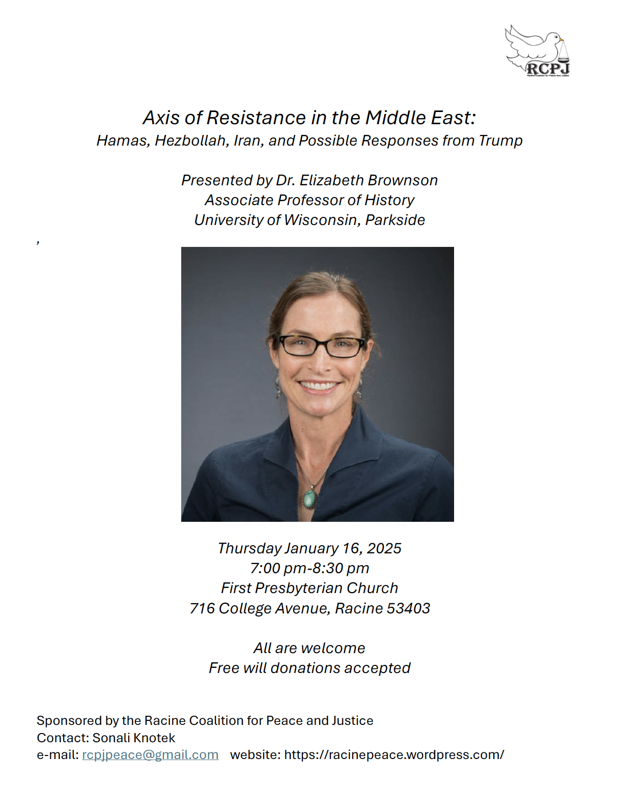 The Racine Coalition for Peace and Justice will present Axis of Resistance in the Middle East: Hamas, Hezbollah, Iran, and Possible Responses from Trump. Elizabeth Brownson of UW Parkside will be the presenter. With her broad knowledge of history and politics of the Middle East, she will speak of the grassroots resistance to the genocide in Gaza, the growing violence against Palestinians in the West Bank, the devastating bombing and invasion of Lebanon, the invasion and bombing of Syria and the Trump administration’s possible response to the resistance.