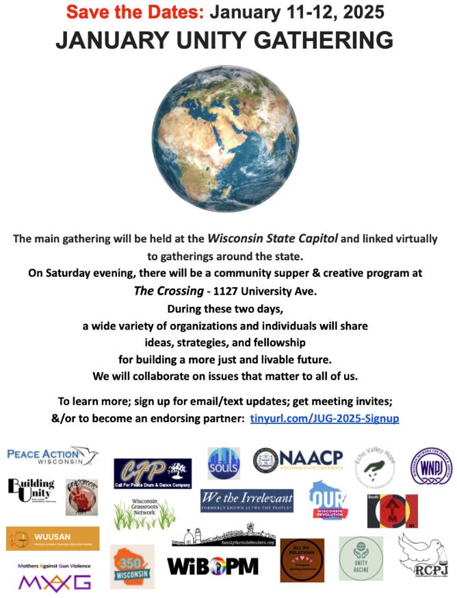 The January Unity Gathering will be a two-day Wisconsin statewide conference held In Madison, WI on January 11-12, 2025.