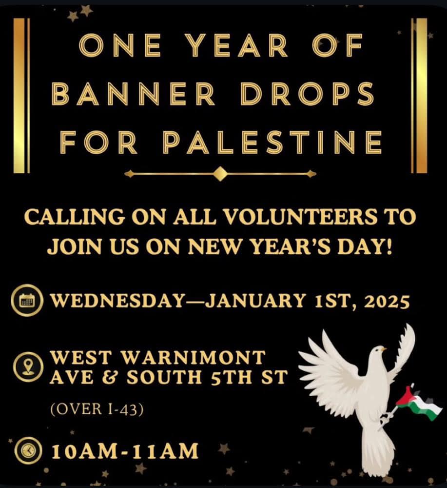 Categories Uncategorized Milwaukee, January 1, 2025: One Year of Banner Drops for Palestine! Post author By WiBOPM Post date December 31, 2024 Share this: Share on X (Opens in new window) X Share on Facebook (Opens in new window) Facebook Like Loading... Related ← ‘I Am a Man’ shines necessary, humanizing light on Black men in Goodman South Madison Library exhibit → Chicago, January 20, 2025: Stop the Trump Agenda! Stop Capitalism!