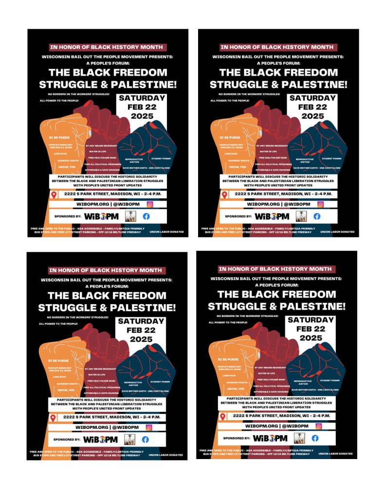 Categories Uncategorized Madison, Feb. 25, 2025: ‘The Black Freedom Struggle & Palestine!’ Post author By WiBOPM Post date January 2, 2025 Facebook Event: https://www.facebook.com/share/NfzWBveEkwXPHLJh/ @wibopm Share this: Click to share on X (Opens in new window) X Click to share on Facebook (Opens in new window) Facebook Like Loading... Related ← Zinn Education Project: Mark Your 2025 Calendars with People’s History Events → Madison, Feb. 20, 2025: ‘Building Worker Power! Corporate Research Class’ – With Ric Urrutia, Co-Host of We Rise Fighting! Labor Podcast