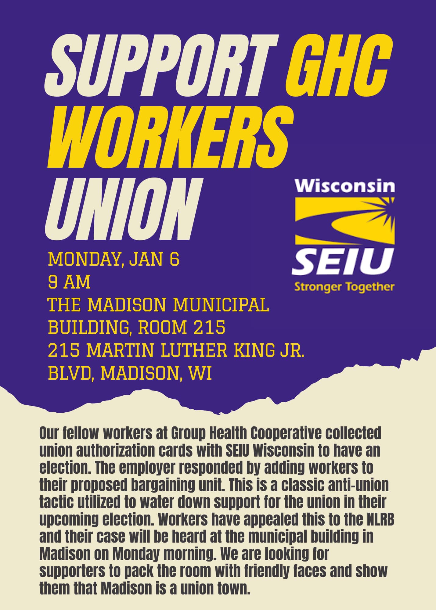 Categories Uncategorized Madison, January 6, 2025: Support GHC Workers Union – Pack NLRB Hearing! Post author By WiBOPM Post date January 5, 2025 Share this: Click to share on X (Opens in new window) X Click to share on Facebook (Opens in new window) Facebook Like Loading... Related ← Milwaukee, January 25, 2025: Voces de la Frontera’s Annual Assembly → Milwaukee4Palestine – Fight U.S.-‘Israel’ Genocide!