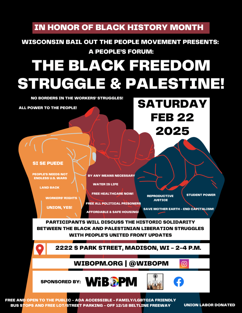 Categories Uncategorized Madison, Feb. 22, 2025: The Black Freedom Struggle & Palestine Post author By WiBOPM Post date January 9, 2025 Wisconsin Bail Out The People Movement Facebook Event: https://www.facebook.com/share/14d27mc39W/ Share this: Share on X (Opens in new window) X Share on Facebook (Opens in new window) Facebook Like Loading... Related ← Venezuela & ALBA News #540, 1.3.2025: Full President Maduro interview with Ramonet; Guarimbas: Managers of Chaos excerpts; upcoming Delegations → Building Unity Gathering January 11-12, 2025! (Registration and Full Schedule)