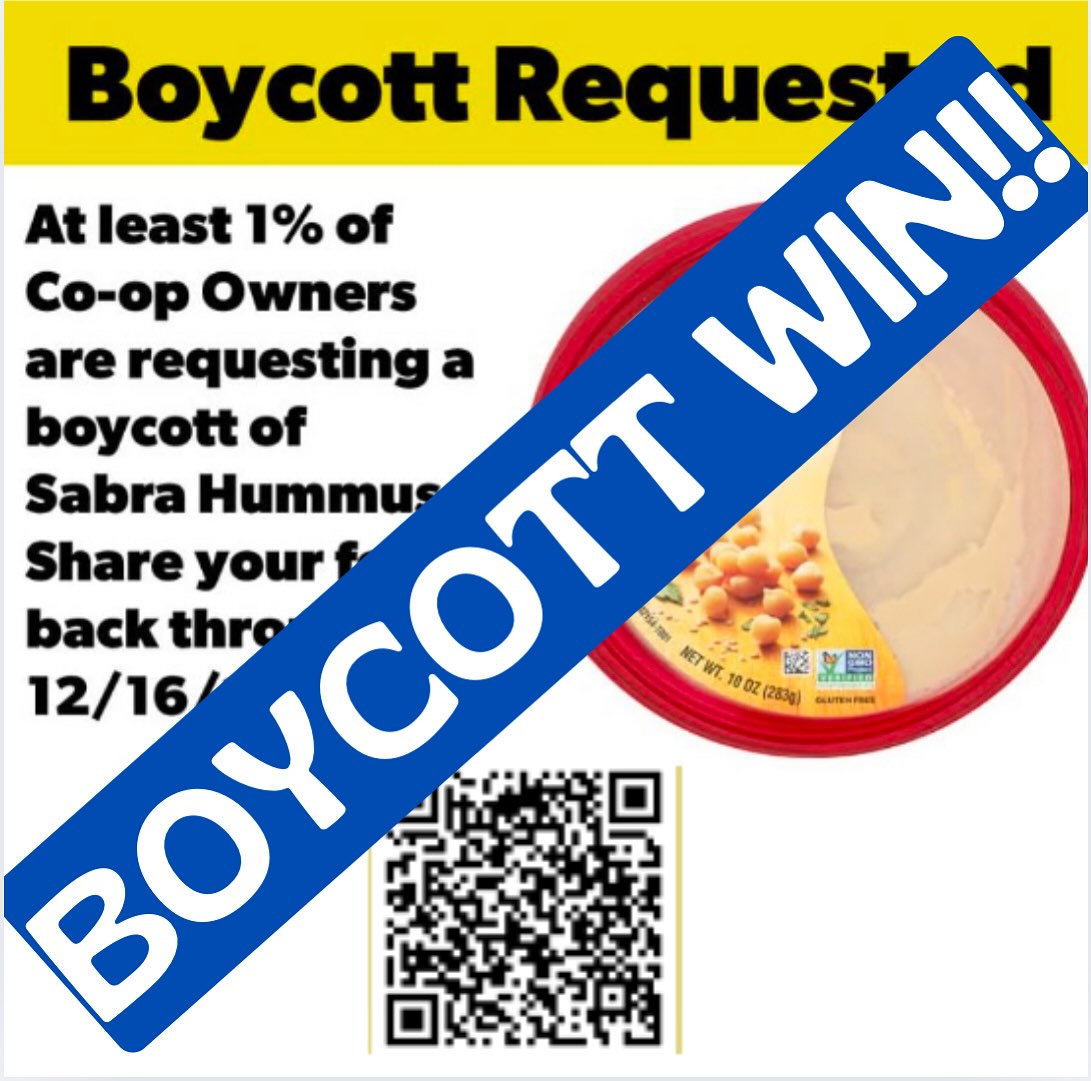 In response to your letters and comments Madison’s Willy Street Co-Op has removed all Sabra products from the shelves at all three Co-op locations! Thank you all for making this victory possible!!