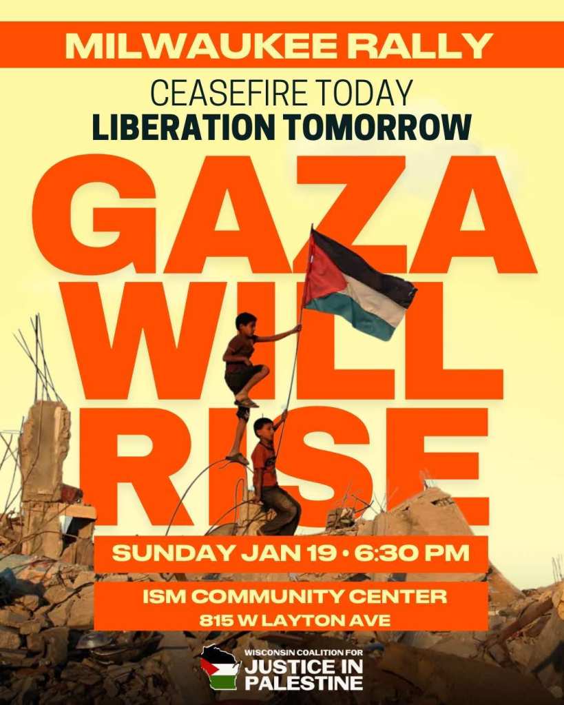 Categories Uncategorized Milwaukee, January 19, 2025: Ceasefire Today! Liberation Tomorrow! – Rally Post author By WiBOPM Post date January 16, 2025 Share this: Share on X (Opens in new window) X Share on Facebook (Opens in new window) Facebook Like Loading... Related ← Oregon healthcare workers continue historic strike – Sign Solidarity Petition → Milwaukee, January 16, 2025: Milwaukee4Palestine – Volunteer Meeting & Art Build