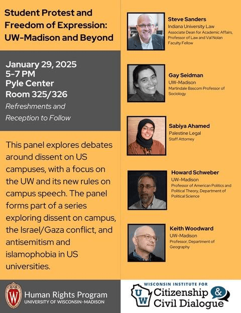 Categories Uncategorized UW Madison, January 29, 2025: ‘Student Protest and Freedom of Expression…’ Post author By WiBOPM Post date January 23, 2025 Open to the public, no registration required. Refreshments will be served at a reception following the event. More details here. Share this: Share on X (Opens in new window) X Share on Facebook (Opens in new window) Facebook Like Loading... Related ← NPR, PBS, and 1,000 Public Stations are at risk – Act Now! → Madison, January 29, 2025: ‘Tantura’ Screening