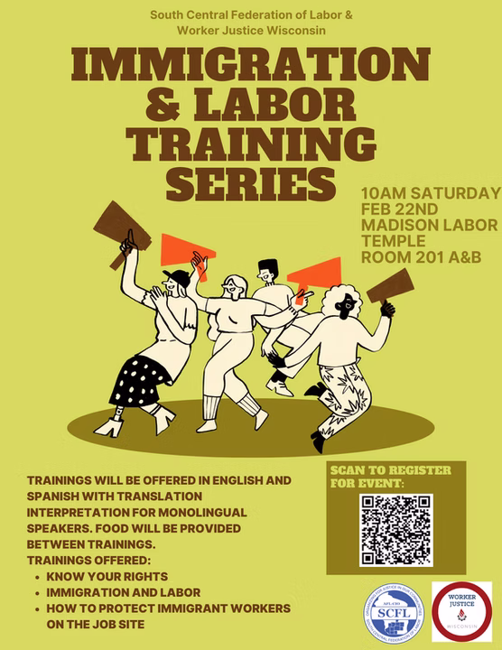 Categories Uncategorized Madison, Feb. 22, 2025: Immigration & Labor Training Series Post author By WiBOPM Post date January 27, 2025 https://www.scfl.org/ Worker Justice Wisconsin Share this: Click to share on X (Opens in new window) X Click to share on Facebook (Opens in new window) Facebook Like Loading... Related ← Madison, Feb. 21, 2025: ‘Joe Hill – Alive As You and Me’ → WI AFL-CIO Community Services Conference March 27 and 28, 2025 in Madison
