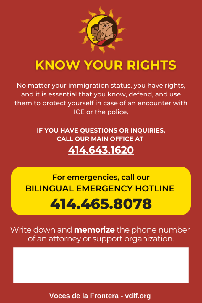 Categories Uncategorized Know Your Rights! Emergencies: 414-465-8078 (Bilingual) – Stop Raids & Deportations! Post author By WiBOPM Post date February 11, 2025 Share this: Click to share on X (Opens in new window) X Click to share on Facebook (Opens in new window) Facebook Like Loading... Related ← Milwaukee, Feb. 11, 2025: Code Pink Community Potluck → May Day Detroit 2025 – Organizing Meeting Feb. 16 at IBEW Local 58