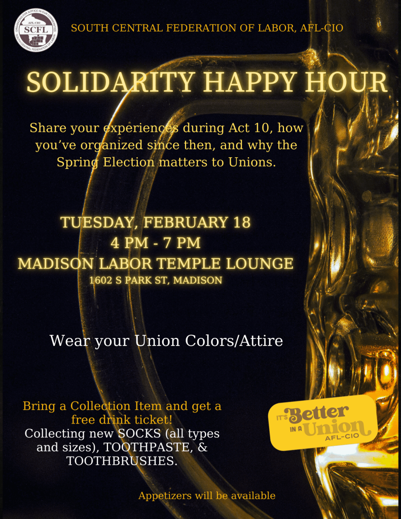 Categories Uncategorized Madison, Feb. 18, 2025: Solidarity Happy Hour! – Building Worker Power in WI and Nationwide! Post author By WiBOPM Post date February 12, 2025 https://www.scfl.org/ South Central Federation of Labor Share this: Click to share on X (Opens in new window) X Click to share on Facebook (Opens in new window) Facebook Like Loading... Related ← Madison, March 6, 2025: Celebrate Tony Terrell Robinson Jr’s Life and Legacy → Voting is a Human Right! Join Winter/Spring 2025 Phone Banking and Canvassing with the South Central Federation of Labor in Madison