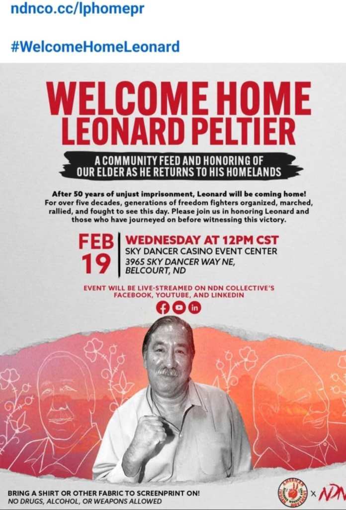 Categories Uncategorized Belcourt, ND, Feb. 19, 2025: Welcome Home Leonard Peltier! Post author By WiBOPM Post date February 16, 2025 Share this: Share on X (Opens in new window) X Share on Facebook (Opens in new window) Facebook Like Loading... Related ← Detroit, March 8, 2025: Defend Jackson, MS Mayor Chokwe Antar Lumumba! → (1947) Moranda Smith Addresses The Congress Of Industrial Organizations Annual Convention, Boston