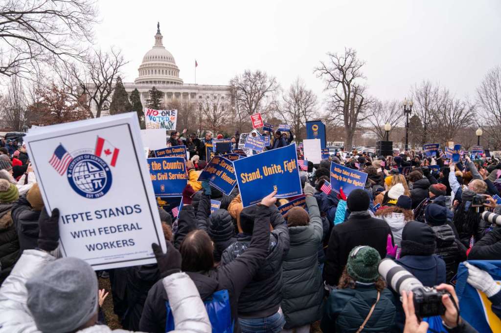 Protesters gather at a rally organized by the American Federation of Government Employees against the “Department of Government Efficiency” purges and resignation offers made to the federal civilian workforce, outside the U.S. Capitol in Washington, D.C., on February 11, 2025. ALLISON ROBBERT / AFP via Getty Images