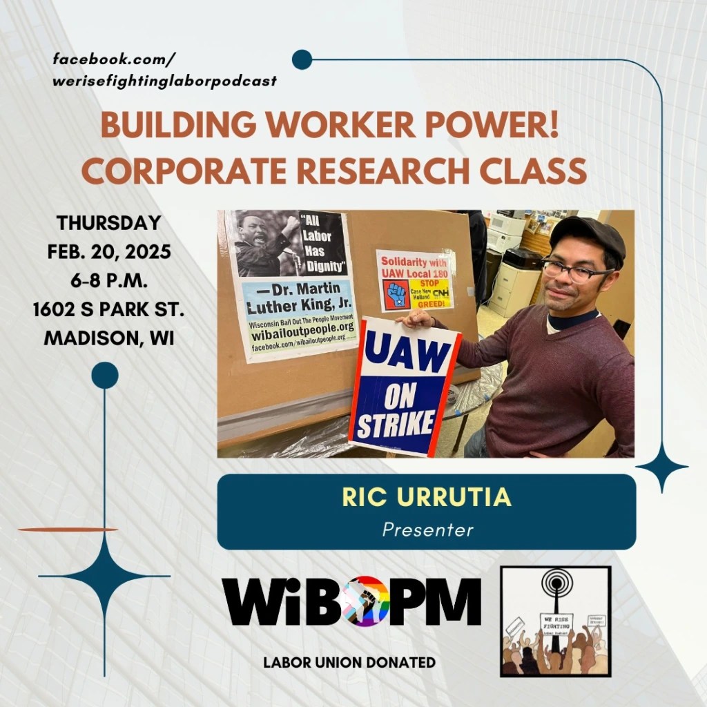 Categories Uncategorized Madison, Feb. 20, 2025: ‘Building Worker Power – Corporate Research Class’ with Ric Urrutia Post author By WiBOPM Post date February 20, 2025 Share this: Share on X (Opens in new window) X Share on Facebook (Opens in new window) Facebook Like Loading... Related ← AFGE Condemns Trump’s Mass Firing of Federal Employees → Madison, Feb. 22, 2025: ‘Black Freedom Struggle & Palestine’ Forum