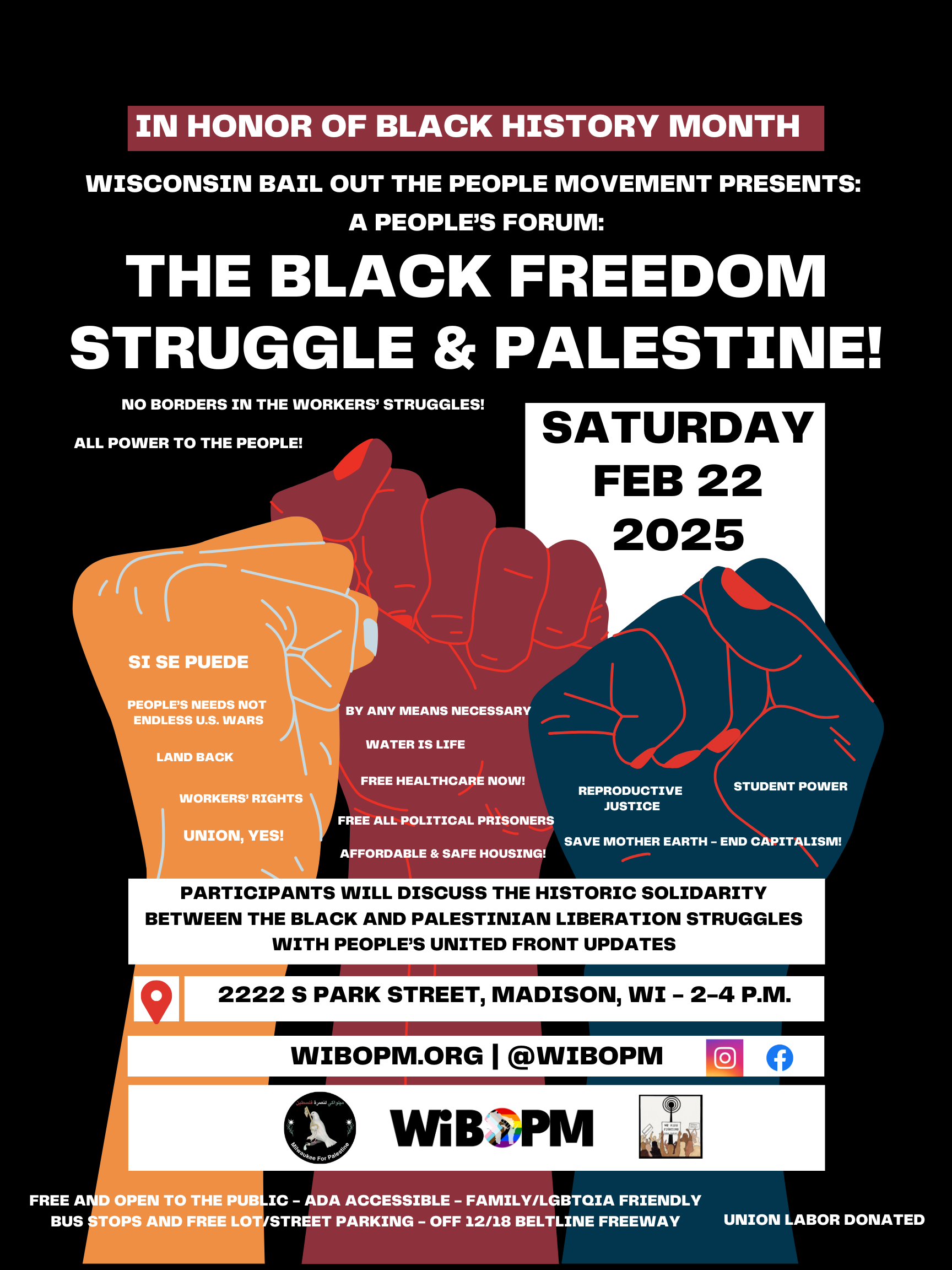 Categories Uncategorized Madison, Feb. 22, 2025: ‘Black Freedom Struggle & Palestine’ Forum Post author By WiBOPM Post date February 20, 2025 Share this: Share on X (Opens in new window) X Share on Facebook (Opens in new window) Facebook Like Loading... Related ← Madison, Feb. 20, 2025: ‘Building Worker Power – Corporate Research Class’ with Ric Urrutia → Statement of APWU President Mark Dimondstein on Attacks to the Public Postal Service