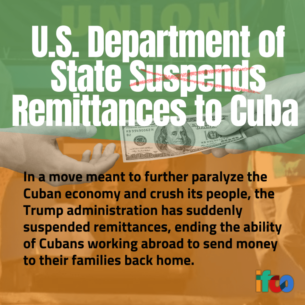 | In a move meant to further paralyze the Cuban economy and crush its people, the Trump administration has enacted a sudden suspension of remittances, ending the ability of Cubans working abroad to send money to their families back home. Western Union has already announced the indefinite pause to money being sent to the island. Orbit S.A., the company processing the remittances, has been put on the Cuba Restricted List by Secretary of State Marco Rubio. Remittances, or remesas in Spanish, play a significant economic role in Cuba, making up between 10-20% of its GDP. This suspension directly impacts the lives of countless Cubans. Without the money transfers from their family members working abroad in the U.S., many will struggle with the cost of food, housing and medicine. In the middle of an economic blockade and tightening sanctions, remittances are a lifeline. Cuba has been facing one of its worst economic crises in decades, with shortages of essential goods, including fuel, and rising inflation. This isn’t the first time remittances have been suspended – the last time was in 2020 at the height of the COVID pandemic. The suspension now is yet another devastating blow to the ongoing crisis, with the criminal, decades-long U.S. economic blockade in the backdrop. The Ministry of Exterior Relations of Cuba stressed that these restrictions directly impact the population and could encourage an increase in migration to the United States. We stand with the Cuban people and reaffirm our solidarity during this economic crisis! We demand: allow remittances and end the blockade! |
