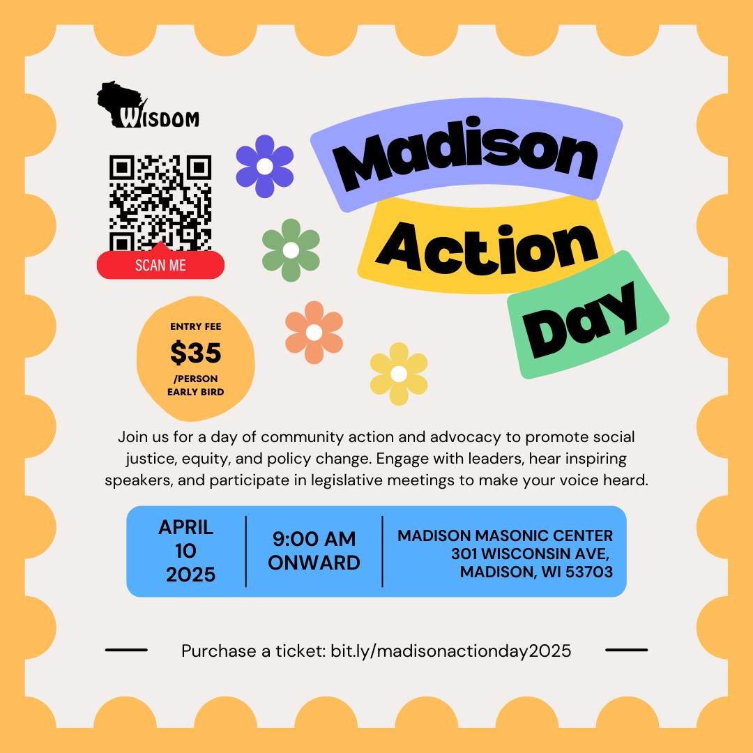 We are excited to invite you to Madison Action Day 2025βa powerful day of community action and advocacy for social justice, equity, and policy change! Join us on April 10, 2025, at 9:00 AM at the Madison Masonic Center (301 Wisconsin Ave, Madison, WI). Engage with leaders, hear inspiring speakers, and participate in legislative meetings to make your voice heard.