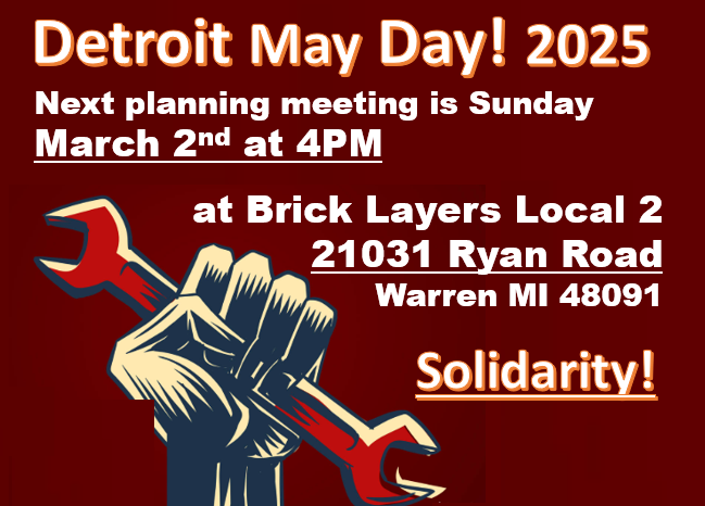 Categories Uncategorized Detroit, March 2, 2025 – May Day Planning Meeting Post author By WiBOPM Post date February 25, 2025 Share this: Share on X (Opens in new window) X Share on Facebook (Opens in new window) Facebook Like Loading... Related ← Make the Call Representatives: NO to dismantling the U.S. Postal Service! → Call Your Representatives to Demand: NO FEDERAL BUDGETS CUTS! (Then Occupy & Strike)