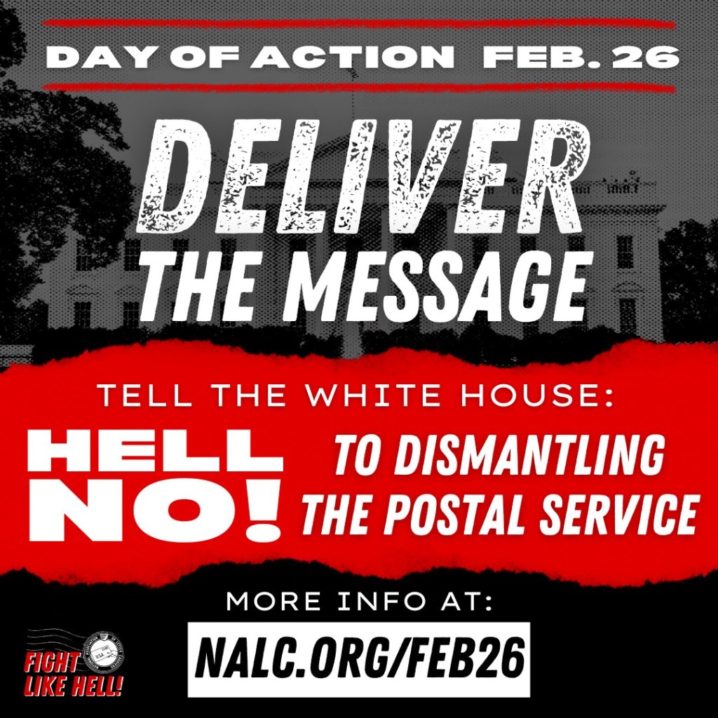 Join us for NALC’s Wednesday, Feb. 26 Day of Action as we tell the White House “hell no!” to dismantling the Postal Service.