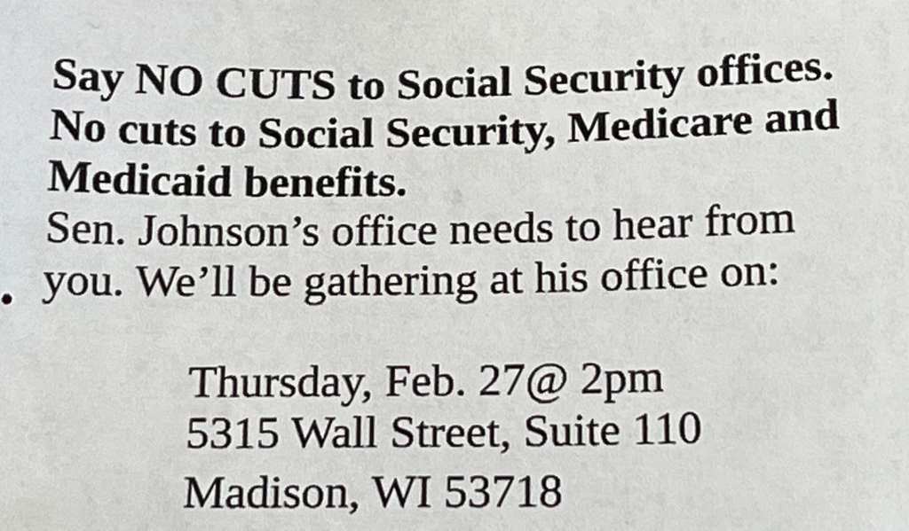 Categories Uncategorized Say NO Cuts to Social Security and Unemployment Insurance, Medicare and Medicaid Feb. 27, 2025 in Madison at Ron Johnson’s Office Post author By WiBOPM Post date February 27, 2025 Share this: Click to share on X (Opens in new window) X Click to share on Facebook (Opens in new window) Facebook Like Loading... Related ← Madison, March 23, 2025: Update From Palestine! with Kristine Wilkie and Martha Monson Lowe → PFLAG Waukesha March 2025 Newsletter