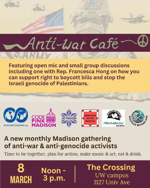 World BEYOND War Madison will meet this Saturday, March 8th, 12 noon – 3 pm at The Crossing on the UW Campus, 1127 University Ave! Anti-War Café is a time to be together, plan for action, make music & art, eat & drink. Featuring this month: open mic, anti-war collage, knitting, and small group discussions including on war tax resistance and right to boycott legislation.