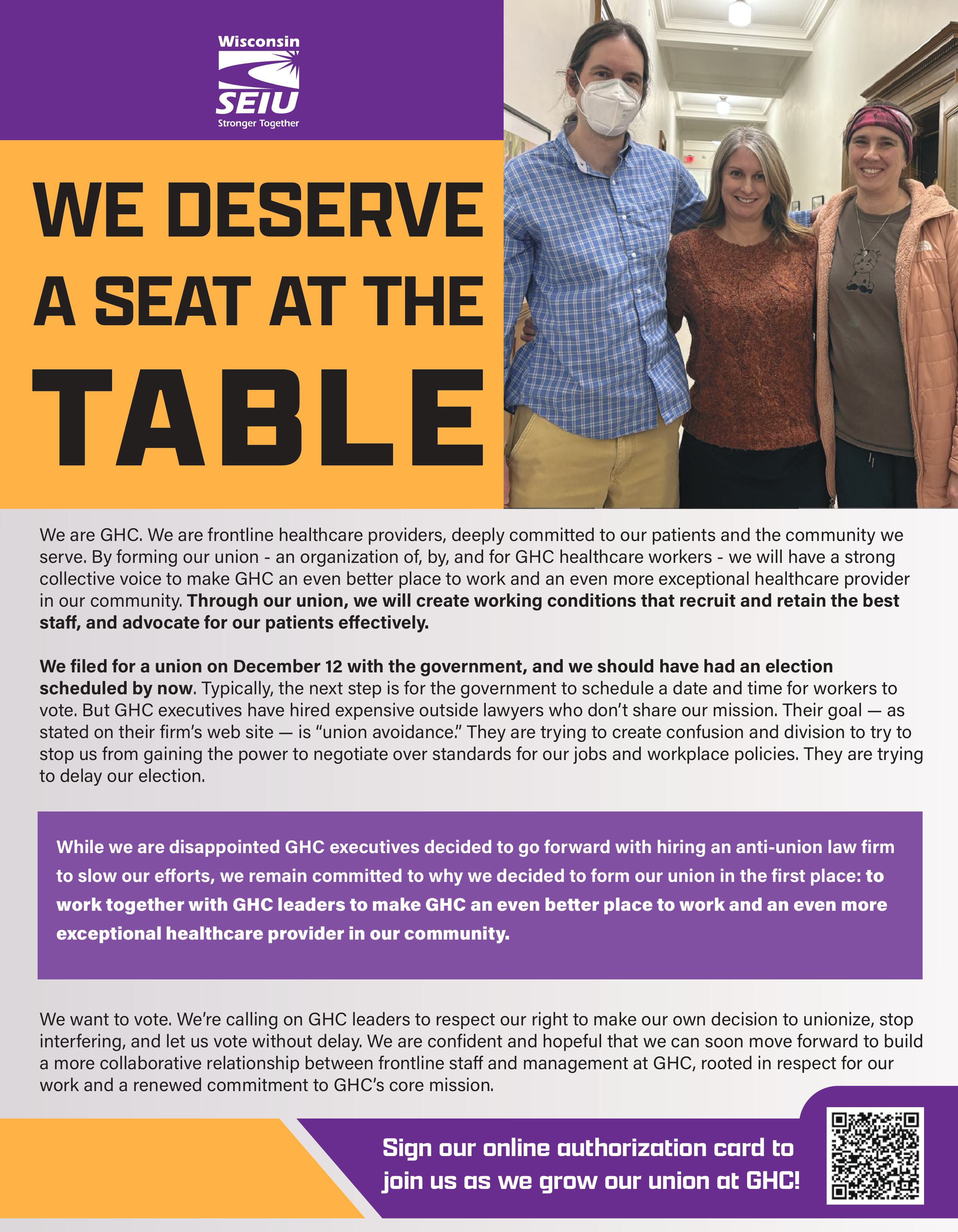 Categories Uncategorized Solidarity with Workers at Group Health Cooperative (GHC) in Madison! – Say NO to Union Busting! Post author By WiBOPM Post date March 2, 2025 https://www.seiuwi.org/campaigns/group-health-cooperative/ Share this: Click to share on X (Opens in new window) X Click to share on Facebook (Opens in new window) Facebook Like Loading... Related ← Milwaukee, March 7, 2025: Stand in Solidarity with Federal Workers at the VA! – Rally! → WI BOPM Attends Fond du Lac Labor Council Annual Dinner – Workers and Community Building Solidarity!