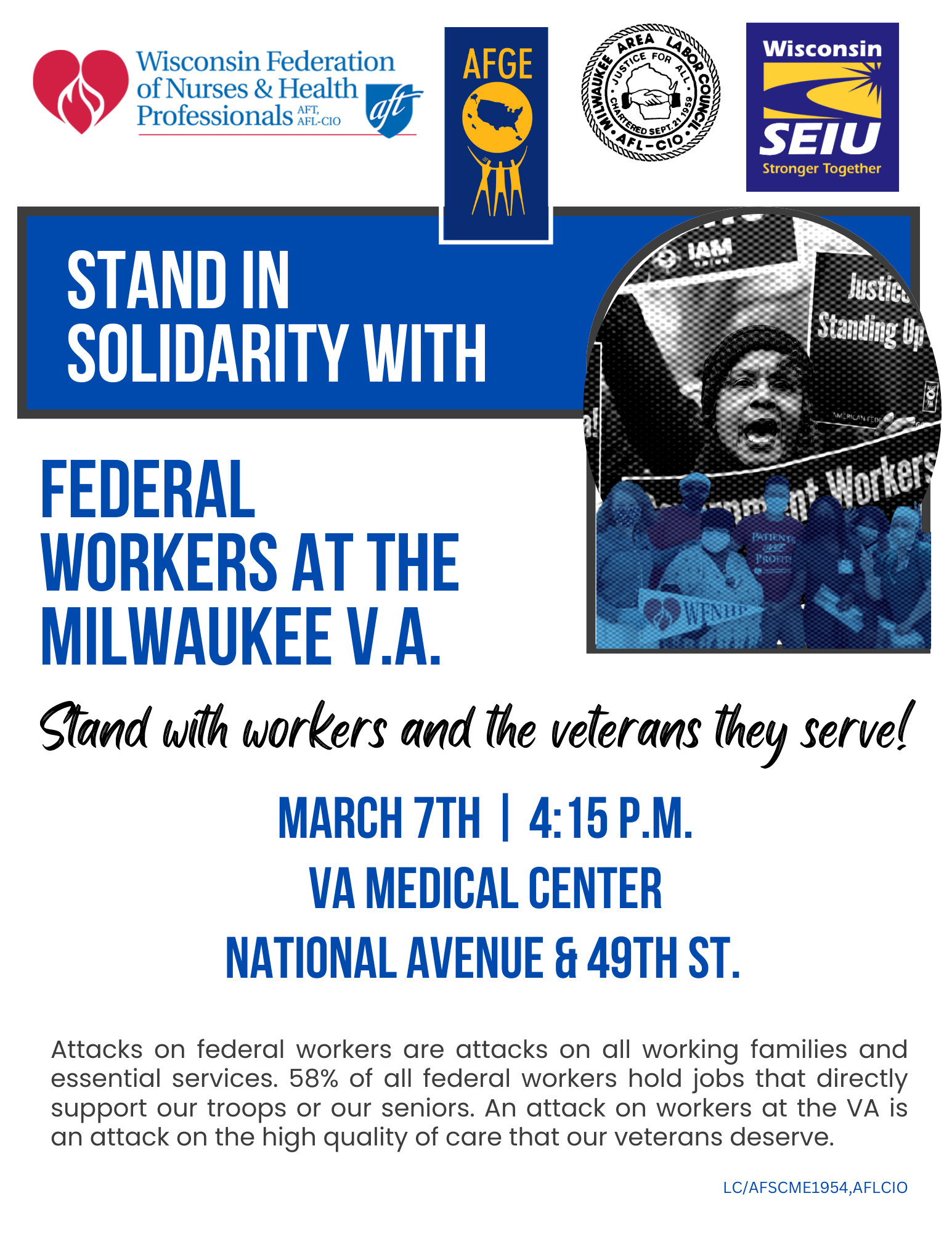 Categories Uncategorized Milwaukee, March 7, 2025: Solidarity Rally for Federal Workers at the V.A.! Post author By WiBOPM Post date March 4, 2025 Share this: Click to share on X (Opens in new window) X Click to share on Facebook (Opens in new window) Facebook Like Loading... Related ← VIDEO, COVERAGE & PHOTOS from Public Schools Week of Action Feb. 2025 → Whitewater, October 4, 2025: 5th Annual Pride Rally!