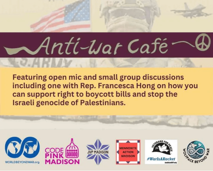 Madison World Beyond War invites the community to the first of a new monthly POTLUCK gathering of anti-war and anti-genocide activists. Time to be together, plan for action, make music & art, eat & drink. This month features open mic, anti-war collage, knitting, and small group discussions. Rep. Francesca Hong and the WI Right to Boycott Campaign will lead a discussion on stopping the Israeli genocide in Palestine, with a focus on how you can support a Right to Boycott law which Rep Hong will introduce in the Wisconsin legislature soon.