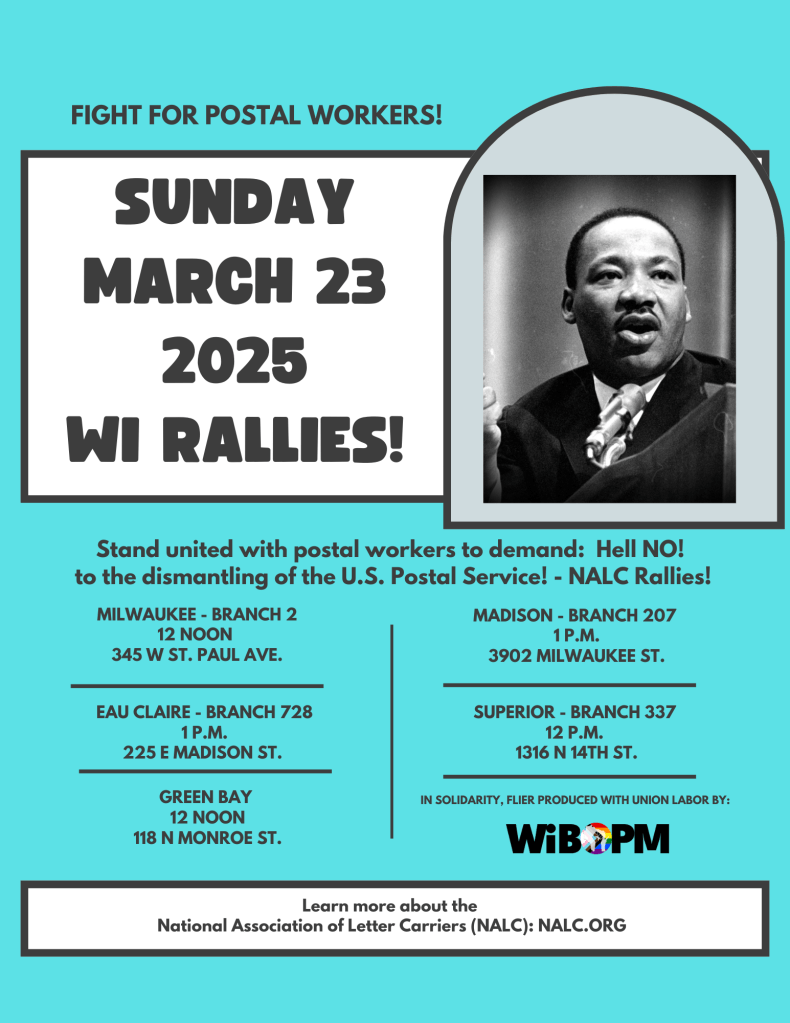 Categories Uncategorized Nationwide March 23, 2025: Fight for Postal Workers! (City Listings in Wisconsin) Post author By WiBOPM Post date March 8, 2025 More Information: https://www.nalc.org/news/nalc-updates/calling-all-branches-organize-a-march-23-rally-to-say-hell-no-to-dismantling-the-postal-service Share this: Click to share on X (Opens in new window) X Click to share on Facebook (Opens in new window) Facebook Like Loading... Related ← Across Wisconsin Workers and Community Members Fight Back Against Racism and Cutbacks! (City Photos) → Wisconsin: The Right to Boycott Campaign