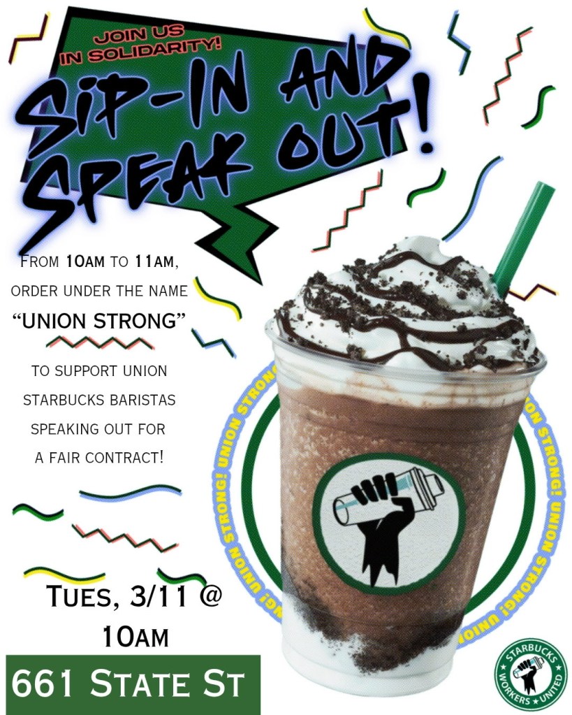 Categories Uncategorized Madison, March 11, 2025: Starbucks Workers United – Sip-in & Speak Out! Post author By WiBOPM Post date March 10, 2025 Share this: Click to share on X (Opens in new window) X Click to share on Facebook (Opens in new window) Facebook Like Loading... Related ← Hands Off Medicaid! – National Call-In Day March 11, 2025! → Milwaukee, March 15, 2025: Smash the Racist, Anti-Worker Trump! Build People’s Power!