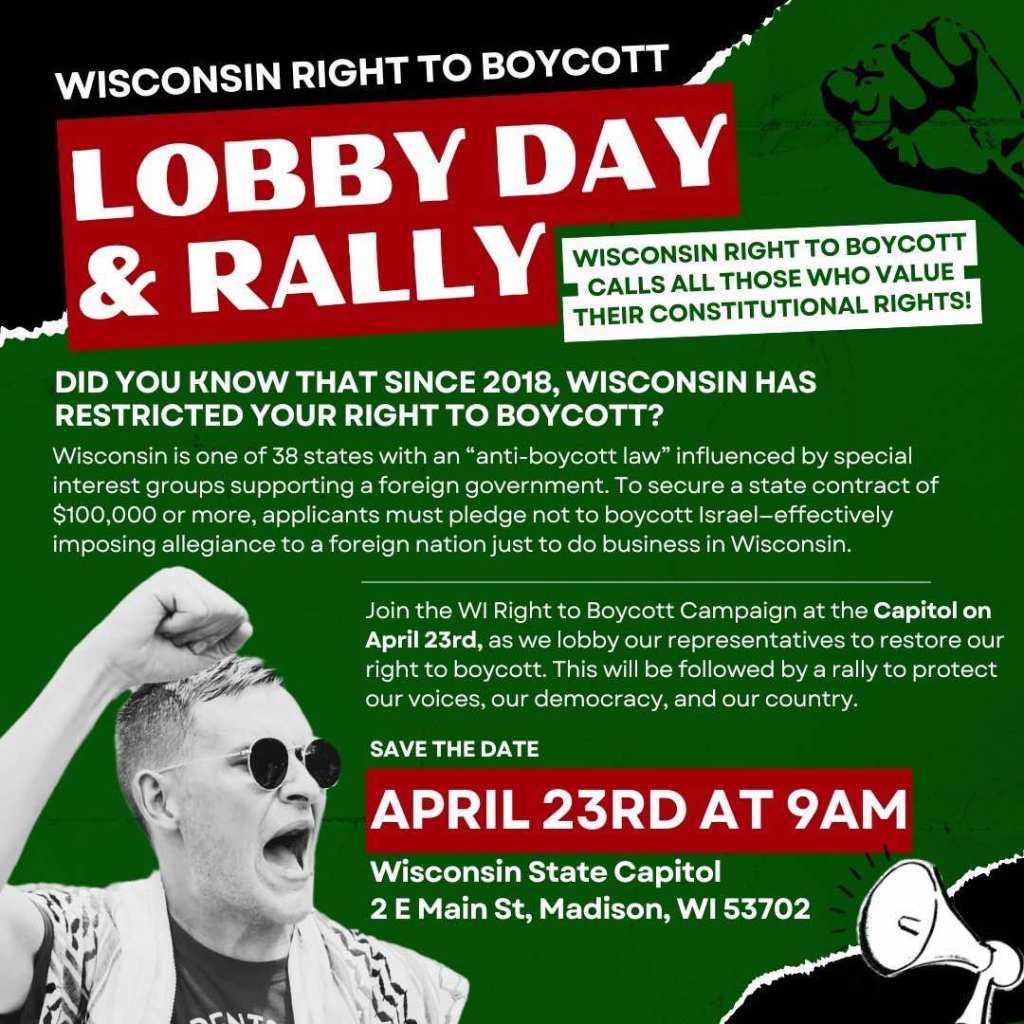 Categories Uncategorized Madison, April 23, 2025: Wisconsin Right to Boycott – Lobby Day & Rally! Post author By WiBOPM Post date March 11, 2025 Share this: Click to share on X (Opens in new window) X Click to share on Facebook (Opens in new window) Facebook Like Loading... Related ← Madison, March 20, 2025: Hands Off Our PUBLIC Postal Service! Rally → Milwaukee, March 14, 2025: Emergency Rally for Mahmoud Khalil!