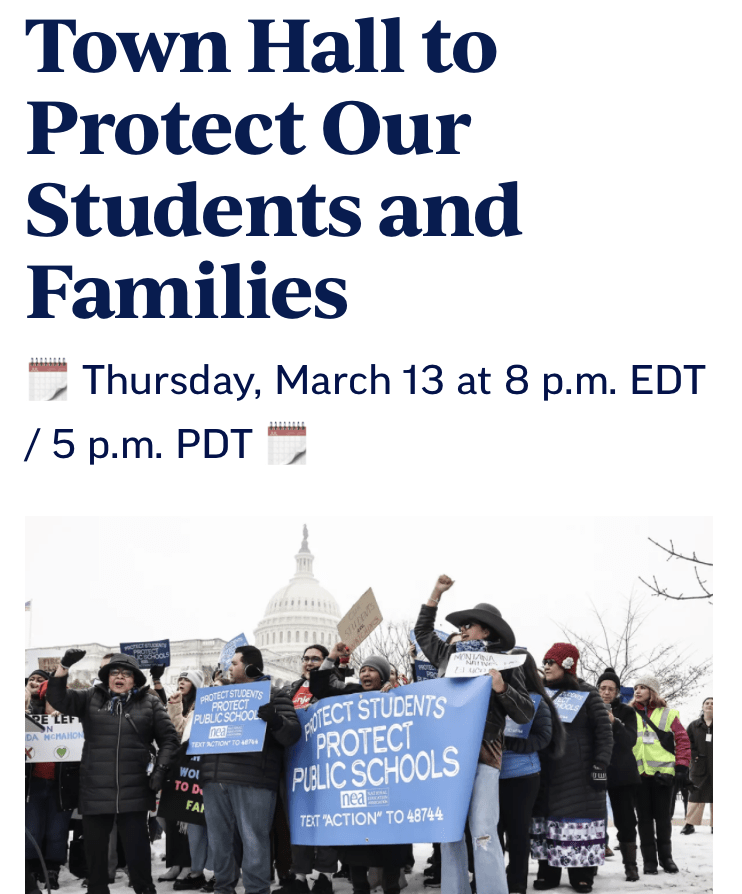 - Join NEA’s National Town Hall to Protect our Students and Families on Thursday, March 13th (8PM EDT/5PM PDT)