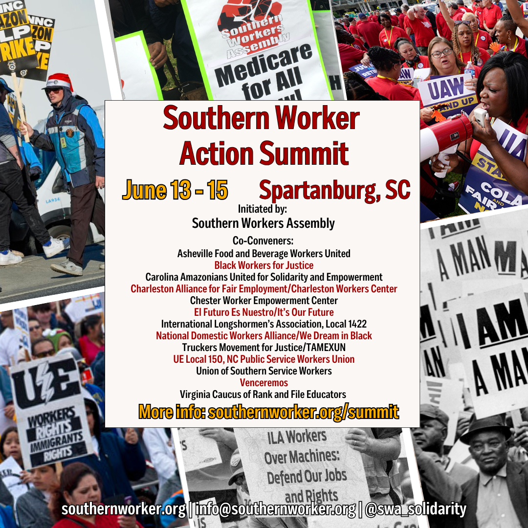 | The U.S. and global economy does not move without the labor of Southern workers. We have tremendous power, not only to fight for control in our workplaces, but to lead movements for broader social change, as Southern workers have time and again throughout history. Now, we face an unprecedented period. We are experiencing a declining quality of life as the price of basic necessities soar, even as the corporations we work for earn record profits, working longer hours, taking on extra jobs, but still not having much to show for it. The Trump administration and the reactionary clique of billionaires they represent and have put in charge are unleashing attacks on migrants and many other sections of the working class, attempting to take a hammer to every measure of social progress won through struggle over the last century. How do we harness our power into a driving force to fight back against the billionaire class’s agenda, build working class organization, and take on the urgent challenge to organize the South and advance a progressive vision for society? The 2025 Southern Worker Action Summit will bring together rank and file workers from sectors and workplaces across the South to address these questions. We’ll discuss, debate, exchange, train, and strategize about how to build a militant, independent, fighting workers movement in the U.S. South. This gathering aims to advance a higher level of unity and consciousness that leads to coordinated collective action and expanded efforts to build committees at unorganized workplaces, workers assemblies, and other forms of organization to build power across industries in the South. Social, economic, and political power can only be realized through targeted organizing of Black, Brown, and all workers in the South. The Southern economic model is rooted in racism, and has resulted in workers here earning the lowest wages, having the lowest levels of unionization, and the lowest measures of quality of life across the board, impacting Black and Brown communities hardest. The states of the South, dominated by some of the most reactionary politicians, are the epicenter of legislation targeting migrant workers and trans youth, severely limiting the right to access abortion, attacking basic voting rights, banning public sector collective bargaining, privatizing education and restricting what can be taught in classrooms, and more. As public services are cut, trillions are spent on war. It doesn’t have to be this way. The key question to addressing these and other challenges faced by the working class is power and the type of organization we can build to exercise it to turn the tide. Throughout history, workers in the South have often faced some of the most repressive and challenging conditions. Despite this, Southern workers have led some of the most militant struggles for social progress, harnessing the power of broad alliances between workers and the community to develop creative and potent methods to fight back. It’s this spirit and long history that we must draw on and channel to confront the crises the working class faces today. It will take determination and a higher level of solidarity, uniting workers across lines of race, gender, nationality, immigration status, sexual orientation, ability, and every other social division the bosses exploit to keep us divided and weak. Unorganized workers, organizations focused on organizing the unorganized, and rank and file union members who see the necessity of building power from the shop floor up should plan to join us in Spartanburg, SC, on June 13 – 15 for this gathering. There’s no time to waste. Initiated by: Southern Workers Assembly Co-Conveners: Asheville Food and Beverage Workers UnitedBlack Workers for JusticeCarolina Amazonians United for Solidarity & EmpowermentCharleston Alliance for Fair Employment/Charleston Workers CenterChester Worker Empowerment CenterEl Futuro Es Nuestro/It’s Our FutureInternational Longshoremen’s Association, Local 1422National Domestic Workers Alliance/We Dream in BlackTruckers Movement for Justice/TAMEXUNUE Local 150, NC Public Service Workers UnionUnion of Southern Service WorkersVenceremosVirginia Caucus of Rank and File Educators |