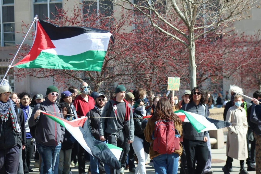 Categories Uncategorized Hundreds of UW students stage walkout in protest of ICE’S detainment of Mahmoud Khalil Post author By WiBOPM Post date March 16, 2025 Hundreds of UW students stage walkout in protest of ICE’S detainment of Mahmoud Khalil Hundreds of students walked out of class at the University of Wisconsin-Madison on March 11 in protest of ICE’S detainment of Khalil Mahmoud. (Photo by Omar Waheed.) Share this: Share on X (Opens in new window) X Share on Facebook (Opens in new window) Facebook Like Loading... Related ← Wisconsin, March 23, 2025: All Out for Postal Workers! No Privatization! Union, YES! (City Listings) → POTUS Ridicules Historic Kingdom of Lesotho in Rambling Address Before Joint Session of Congress