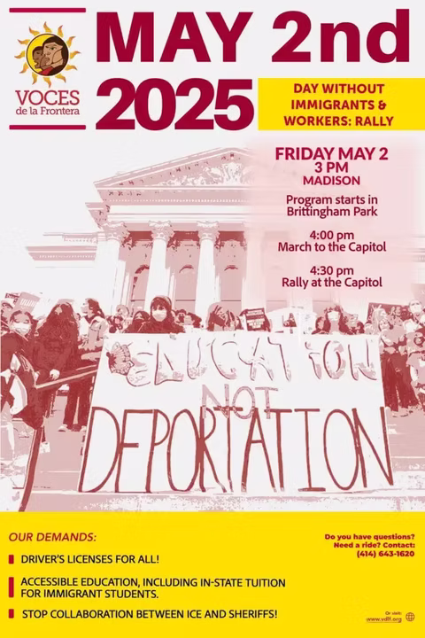 Categories Uncategorized Madison, May 2, 2025: Day Without Immigrants & Workers Rally and March Post author By WiBOPM Post date March 16, 2025 Share this: Click to share on X (Opens in new window) X Click to share on Facebook (Opens in new window) Facebook Like Loading... Related ← Madison, April 5, 2025: Immigration & Labor Training Series → Madison, May 21, 2025: 63rd Annual Bean Feed
