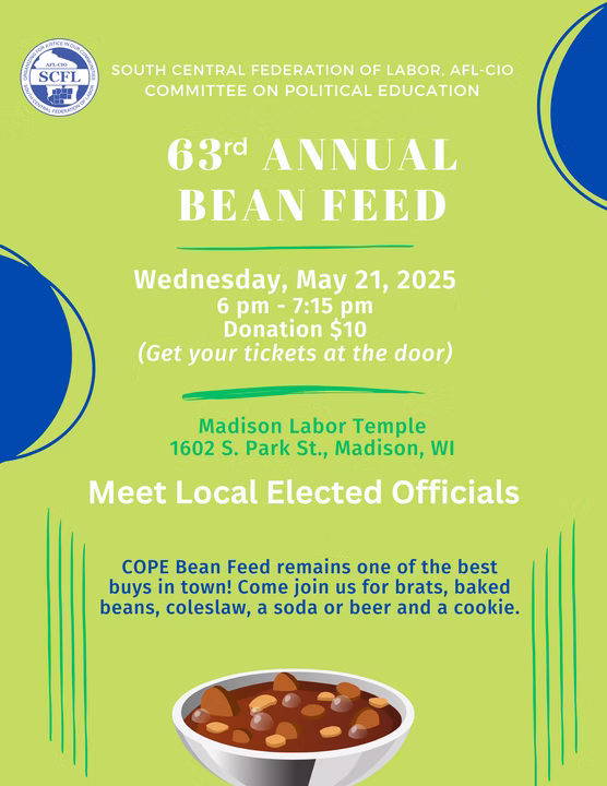 Categories Uncategorized Madison, May 21, 2025: 63rd Annual Bean Feed Post author By WiBOPM Post date March 16, 2025 Share this: Click to share on X (Opens in new window) X Click to share on Facebook (Opens in new window) Facebook Like Loading... Related ← Madison, May 2, 2025: Day Without Immigrants & Workers Rally and March → McFarland, May 10, 2025: 16th Annual Grassroots Festival