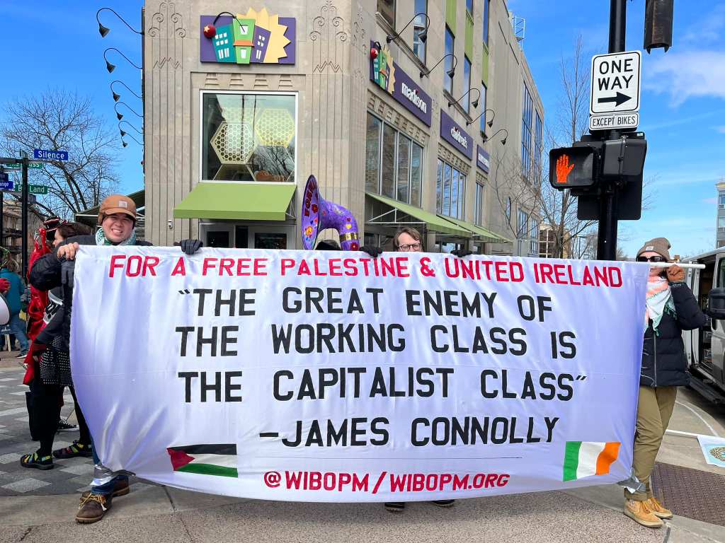 Categories Uncategorized @wibopm Members Join Madison St. Patrick’s Day Parade With Irish – Palestine Solidarity Banner With James Connolly Quote Post author By WiBOPM Post date March 16, 2025 March 16, 2025 Madison, WI. / Photo: Wisconsin Bail Out The People Movement Share this: Share on X (Opens in new window) X Share on Facebook (Opens in new window) Facebook Like Loading... Related ← McFarland, May 10, 2025: 16th Annual Grassroots Festival → Milwaukee May Day 2025